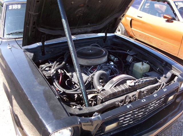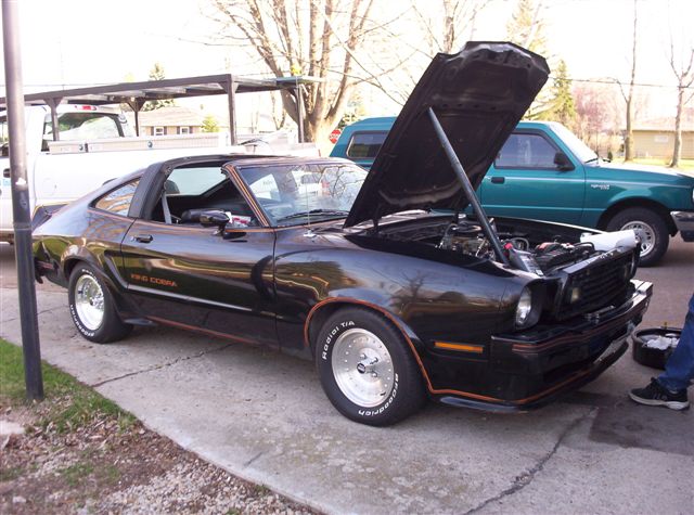 My husband bought this car as a parts car, but after some down time with his car he got this car started and driving to fill the weeks at the drag strip. He bought the car for $75 bucks and the guy threw in the cobra valve covers for an extra $25. The car has a new motor (stock) with an Edelbrock dual plane manifold, Holly 650 carb, headers and a sweet sounding set of duals that stop before the rear axle. The tranny is stock with a new clutch, the rear end has 4:11 gears with a Power Trax posi center section. The body is original with a backwards hood scoop? AM/FM 8-track with Billy Joel Glass Houses supply the toons. The car has some surface rust but it has solid Floors, radiator core support and battery tray. Best run @ WIR 1/4 mile Drag Strip 2003 was a 16:6l @85MPH smoking the 14" tires all the way. On a nice day I like to pull the T-Tops and Cruz.