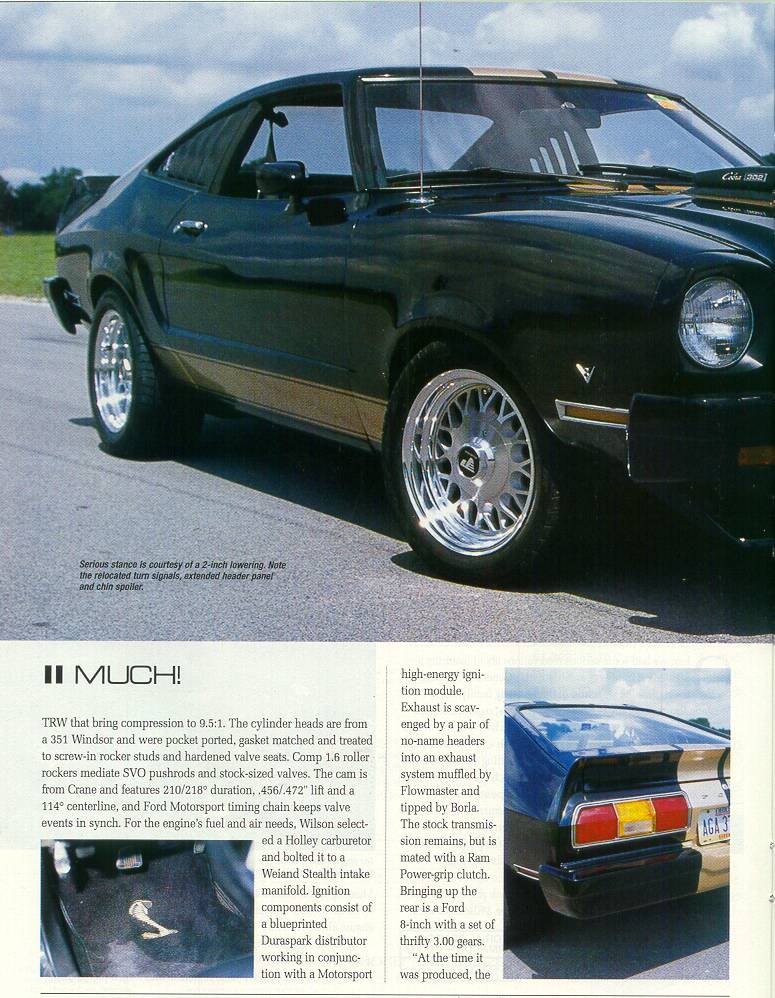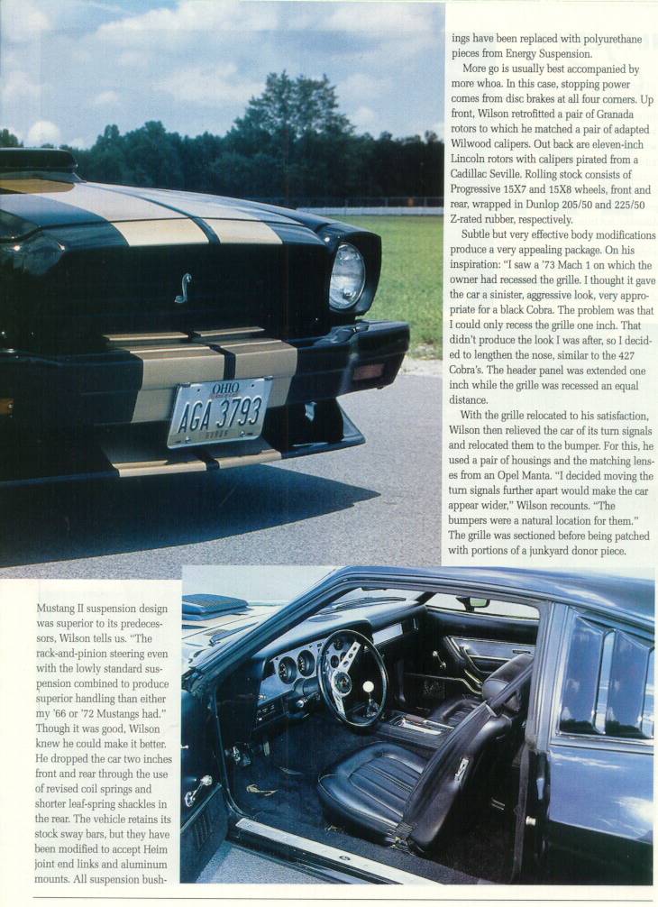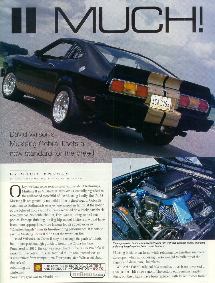 David Wilson's 1976 Ford Mustang Cobra II has got to be one of the finest examples of what a little modifying can do to further improve upon the Mustang II. From increasing engine power output to mildly, and tastefully altering the exterior looks, this machine's got it. Below are scans from a recent feature article of this car in Mustang Illustrated. Please allow time for each page to load; each image is about 100-150K in size, and best viewed on a monitor at least 800 pixels wide. Clicking each link will open a new browser window.