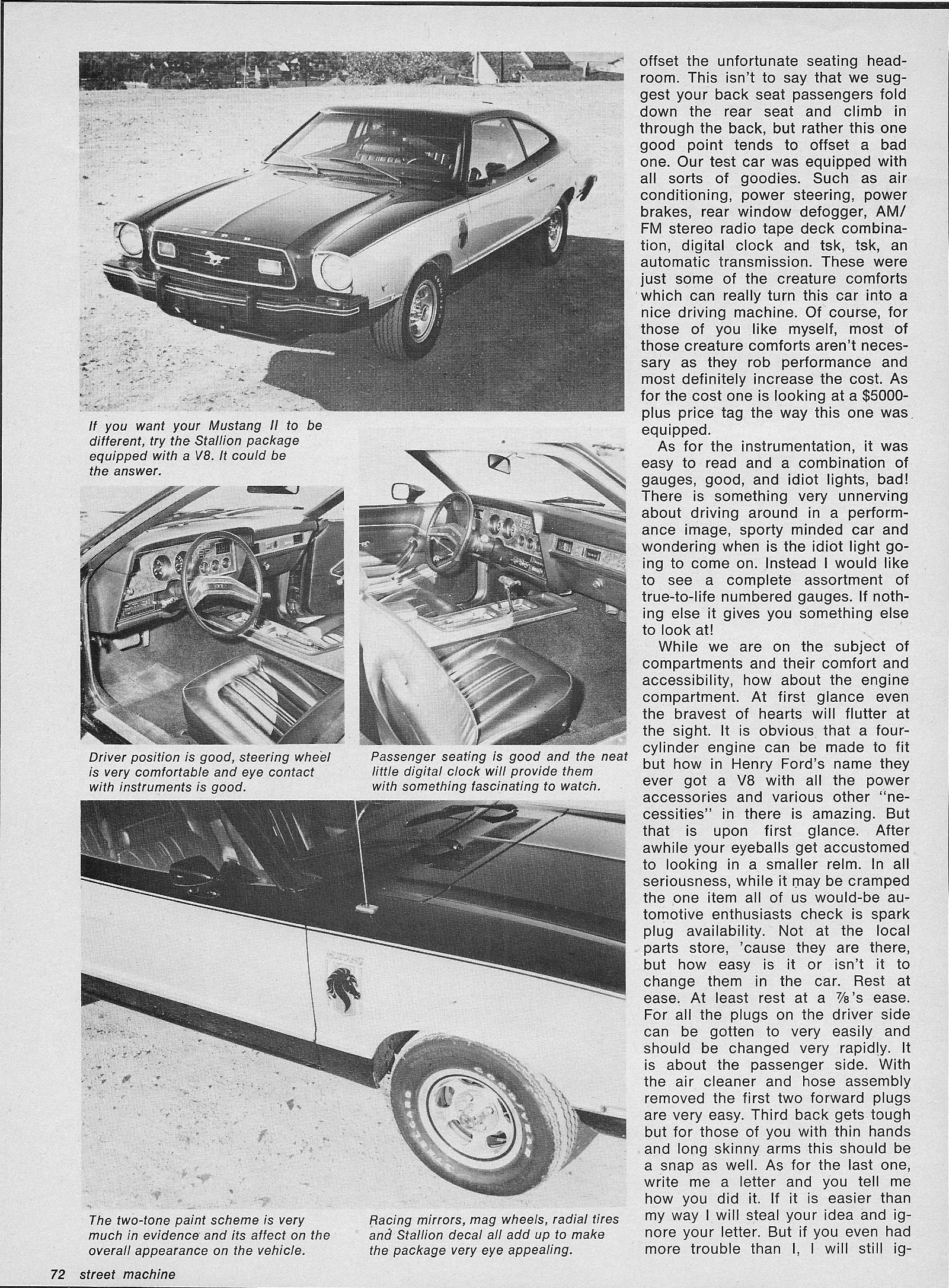 offset the unfortunate seeting headroom. This isn't to say that we suggest your back seet passengers fold down the rear seat and climb in through the back, but rather this one good point tends to offset a bad one. Our test car was equipped with all sorts of goodies. Such as air conditioning, power steering, power brakes, rear window defogger, AM/FM stereo radio tape deck combinateion, digital clock and tsk, tsk, an automatic transmission. These were just some of the creature comforts which can really turn this car into a nice driving machine. Of course, for those of you like myself, most of those creature comforts aren't necessary as they rob performance and most definitely increase the cost. As for the cost one is looking at a $5000-plus price tag the way this one was equipped.