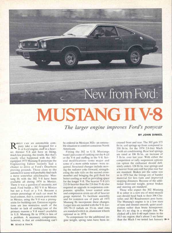 RARELY CAN AN automobile company take a car designed for a 4- or 6-cyl engine, stuff in a heavier, thirstier V-8 and have us liking, much less praising, the results. But that's exactly what happened with the 302-equipped 1975 Mustang II prototype the Engineering Editor recently had a chance to drive at Ford's Dearborn proving grounds. Those close to the automotive scene will probably find such a move somewhat anticlimactic: Mustang IIs with the 302 V-8 have been available all during 1974 in Mexico. There it was a question of necessity, not need. Ford builds a 302 V-8 in Mexico but not a 4-cyl or a V-6. Because a certain percentage of each car must be local content, that is, contain parts made in Mexico, using the V-8 was a prerequisite for building cars. Emission regulations are less restrictive south of the border so lack of cooling (one of the primary reasons a V-8 wasn't available in U.S. Mustang IIs in 1974) is less of a problem. A necessary compromise, however, is that air conditioning can't be ordered in Mexican 302s-an untenable situation to comfort-conscious North Americans.